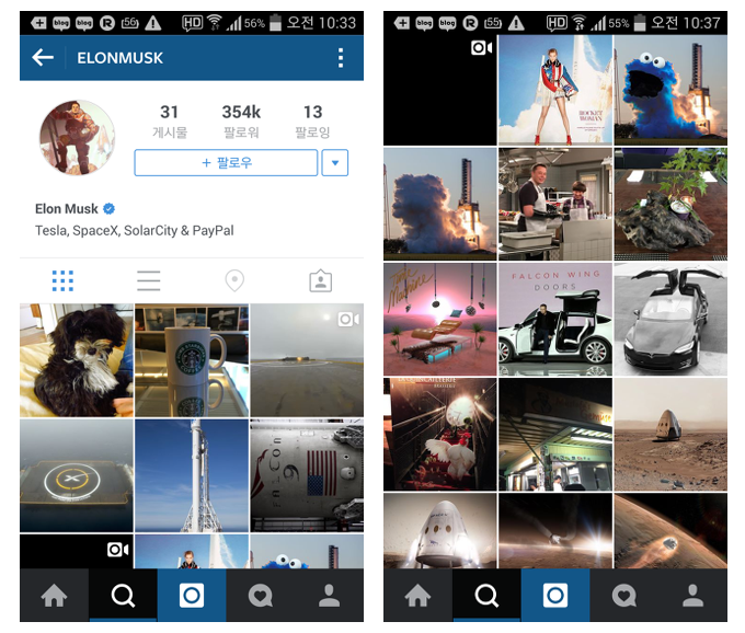 팔로워 35만 4천명 입니다 어마어마하죠? 미래지향적인? 자동차와 우주로켓이 다채롭네요