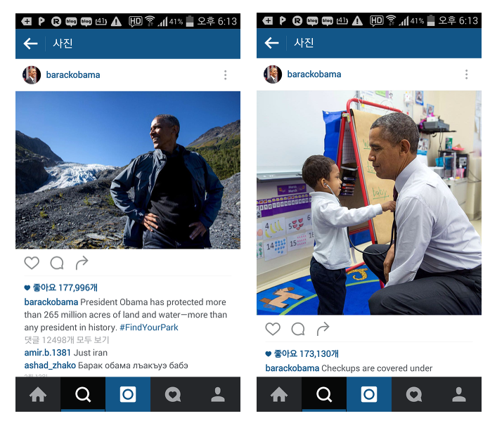 페이스북 통해서 대중과 앞장서서 소통했던 오바마 대통령 , 그의 인스타그램 계정에 들어가봤습니다.