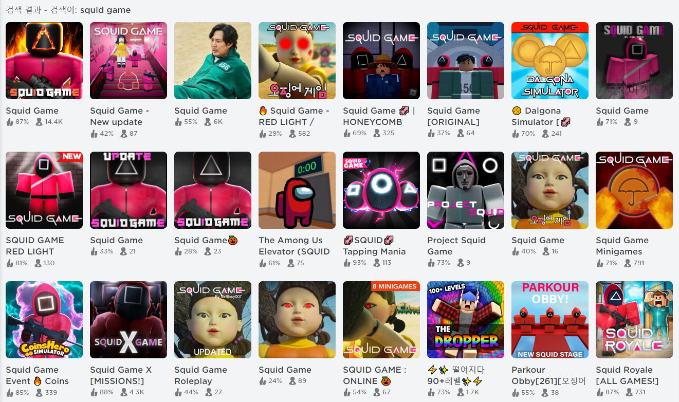 요즘 정말 핫한 '오징어게임' 메타버스 이야기부터 시작해보겠습니다. 넥플릭스에서 대박을 낸 한국 제작사 드라마 '오징어 게임'이 메타버스에서도 인기입니다. 로블럭스에서 '오징어게임' 드라마를 검색하면 (squid game) 관련 콘텐츠가 1000개를 넘어갑니다. 오징어게임 유튜브영상이 넘쳐나는 것 처럼, 메타버스도 예외가 아닙니다.
