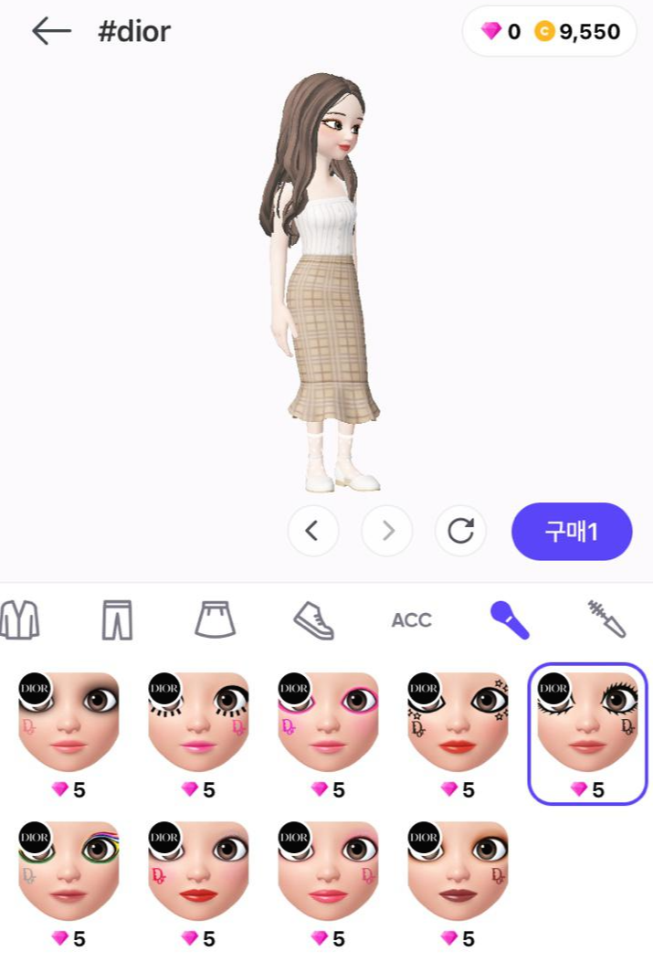 이번 크리스찬 디올 컬렉션은 피터 필립스(Peter Phillips) 메이크업 크리에이티브&이미지 디렉터가 제페토를 위해 고안한 총 9가지 메이크업 세트로 구성되어있습니다. 제페토의 뷰티 브랜드 입점은 아직은 더딘 상황으로 아바타 특성상 꾸밀 수 있는 영역이 얼굴로 한정적이기 때문인데요. 현재는 디올만이 제페토와 협업을 진행, 아바타 얼굴에 적용할 수 있는 페인팅 메이크업을 판매하고 있습니다.