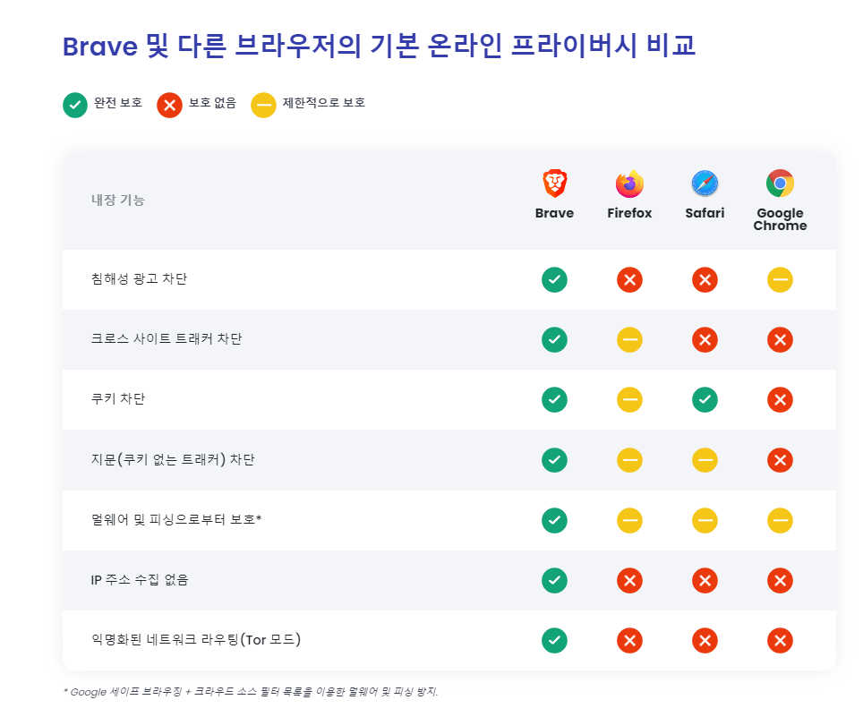 두 가지 장점 모두 광고를 없애는 전략에서 나타나게 되었습니다. 데스크톱의 경우 크롬과 파이어폭스보다 로딩속다가 20배 빠르며, 스마트폰의 경우 크롬(안드로이드)나 사파티(iOS) 보도 페이지 로딩 속도가 최대 8배 빠르다고 합니다.기술적인 요인으로 인한 성능향상이 아닌 정책적인 (광고와 광고추적기를 제거함으로써) 요인으로 이렇게 속도가 향상 될 수 있다니 대단합니다.