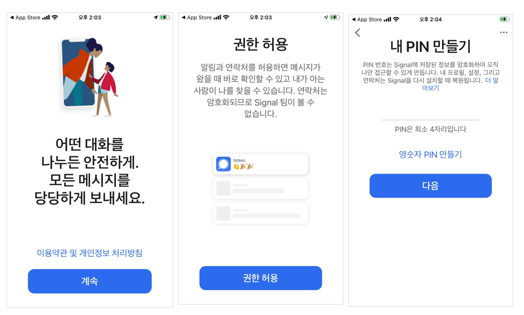메신저 '시그널 '화면입니다. 탈중앙화이므로 프라이버시 침해가 없고, 통제가 없는 것이 특징입니다.