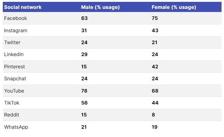 현재 소셜 미디어 사용자의 성별분포를 보면 남자 54% 여자 46%가량인데요, 세부적인 자료를 보면 아래와 같습니다.
