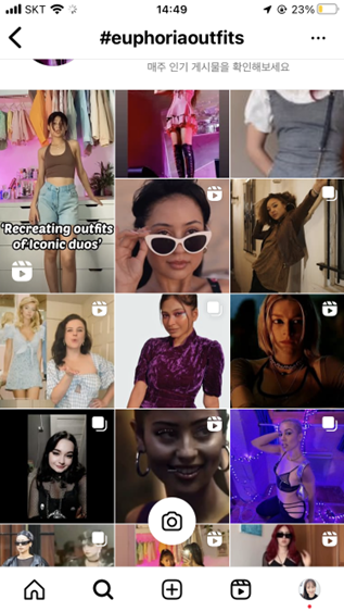 대표적인 예가 전 세계 MZ세대의 마음을 사로잡은 드라마 <유포리아 Euphoria> 로 최고 관전 포인트는 등장인물의 스타일링입니다. 2019년 첫 방영 이후 ‘유포리아 룩’이 패션장르로 굳어졌으며, 2023년 4월 공개된 CNN기사에 따르면 #euphoriaoutfits’에 태그된 동영상이 틱톡에서만 수 천건에 이르고, 각종 SNS를 통해 2,800만 회가 넘게 재생된 것으로 나타났습니다.