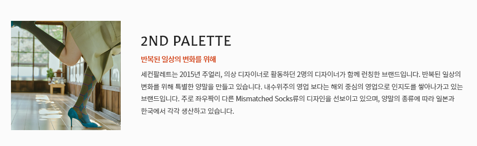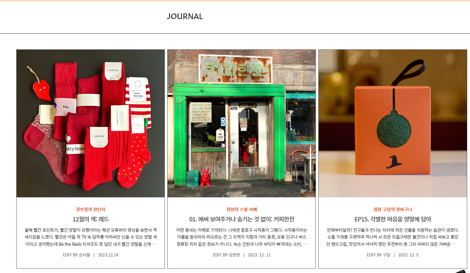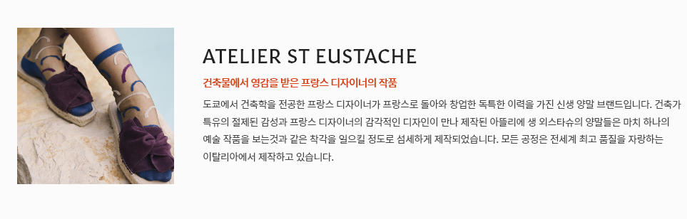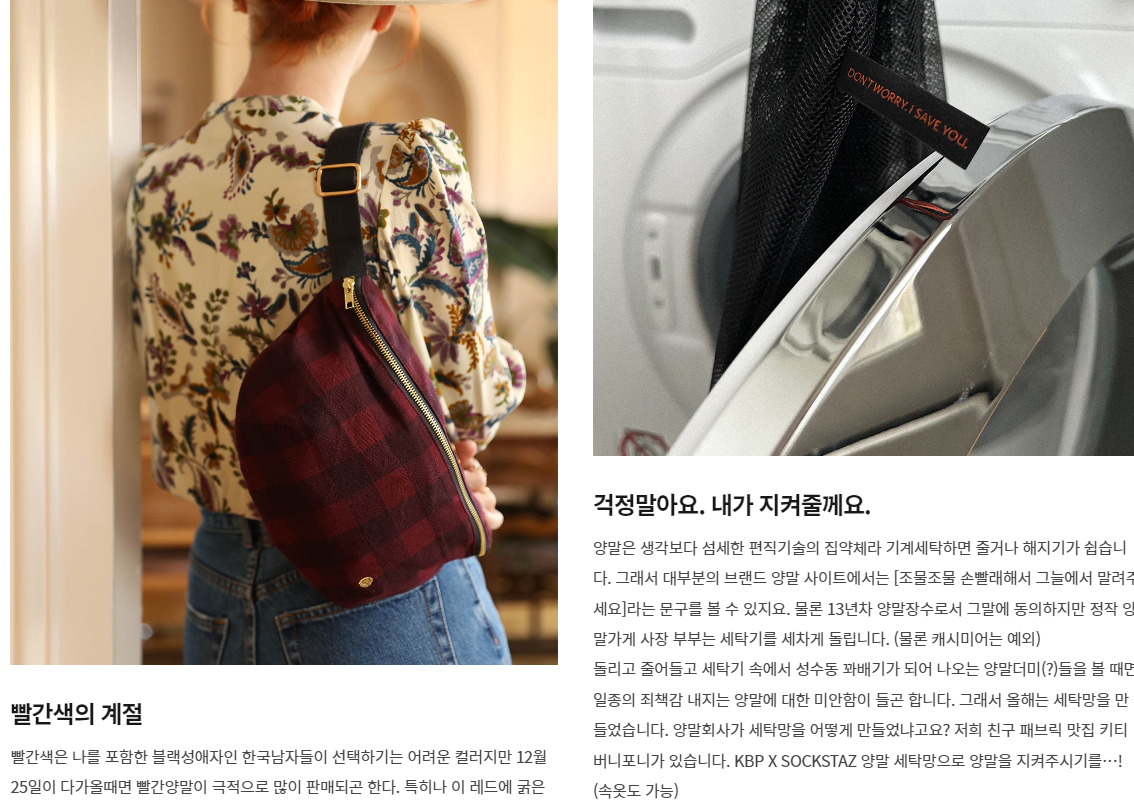 어지럽지 않게 정돈된 디스플레이와 감성 화보컷의 일관된 톤&매너.. 잔잔한 스토리텔링을 통해 아날로그 감성이 느껴지는 양말 가게입니다. 쇼핑몰이 브랜드 홈페이지처럼 감각적이고 세련된 해외 사이트와 견주어도 손색이 없네요.