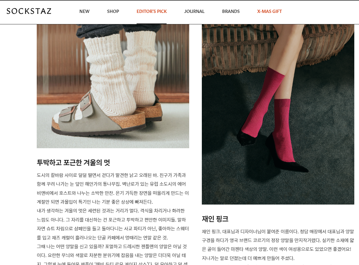뭐지? 쇼핑몰 맞아? 처음 양말가게 삭스타즈를 방문하면 여성잡지를 보는 듯합니다. 양말에 관한 다양한 스토리텔링이 흥미롭고, 술술 재미있게 읽혀집니다. 신박하다 ^^