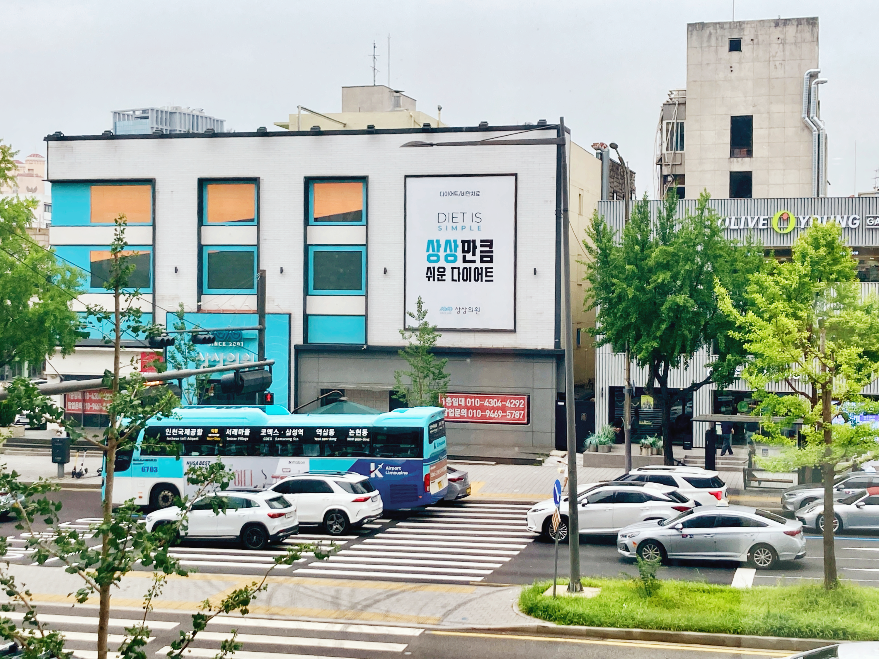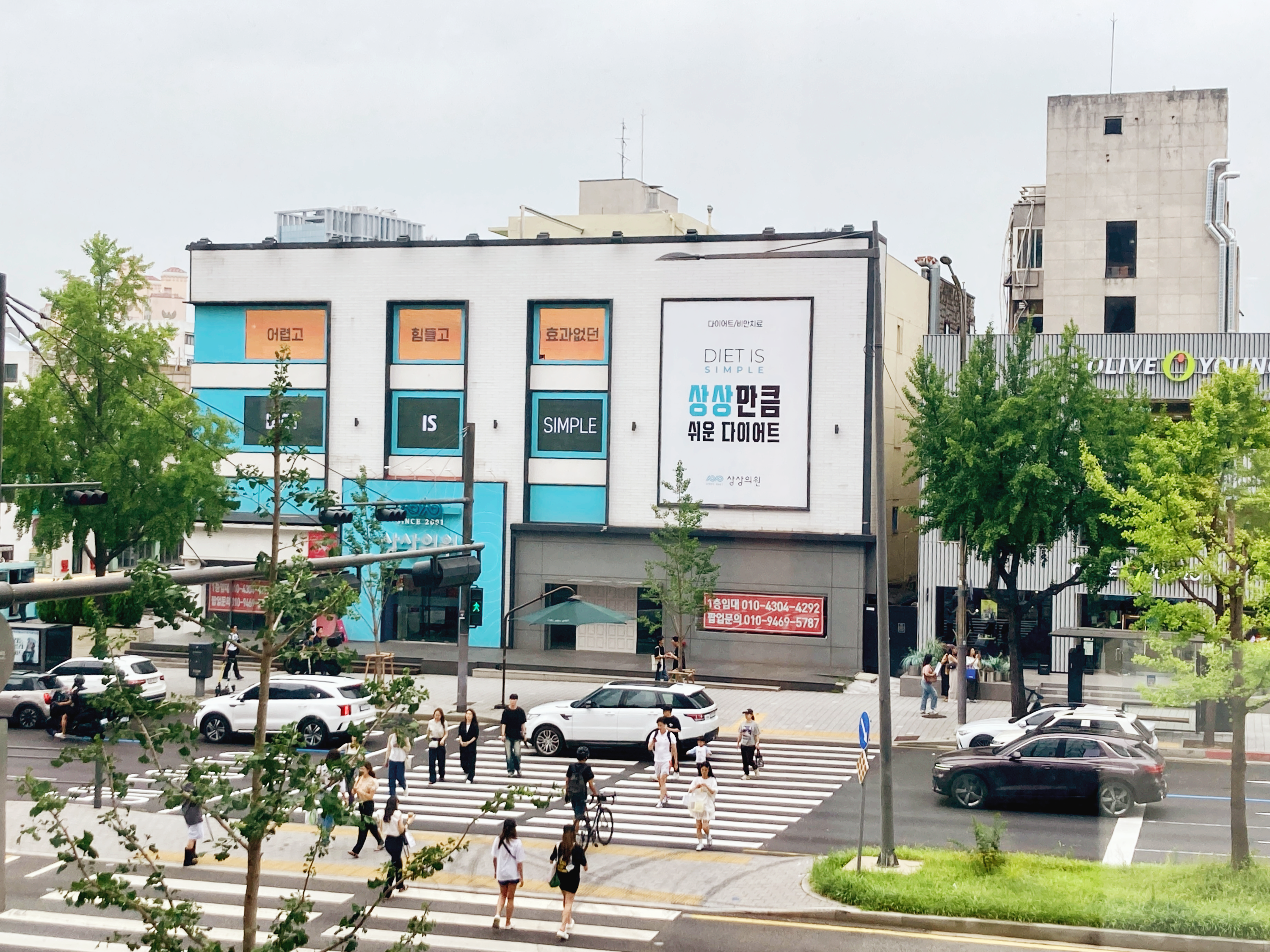 강남에 거리입니다. 반포대로 쯤인데요. 건물 한 면 전체를 옥외광고로 활용하고 있습니다.