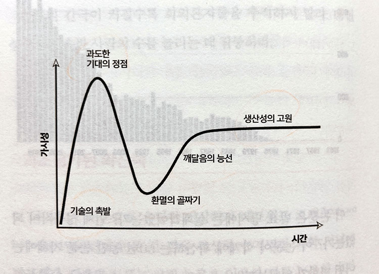 로저스의 곡선은 새로운 아이디어나 기술, 제품이 사회에 어떻게 퍼져나가는지 설명하는 이론입니다. 이와 관련해서 재키 펜은 '가트너 하이프 사이클'이라는 것을 개발했습니다. 이 모델은 아이디어가 문화에 어떻게 확산하는지 보여주는 그래프입니다.