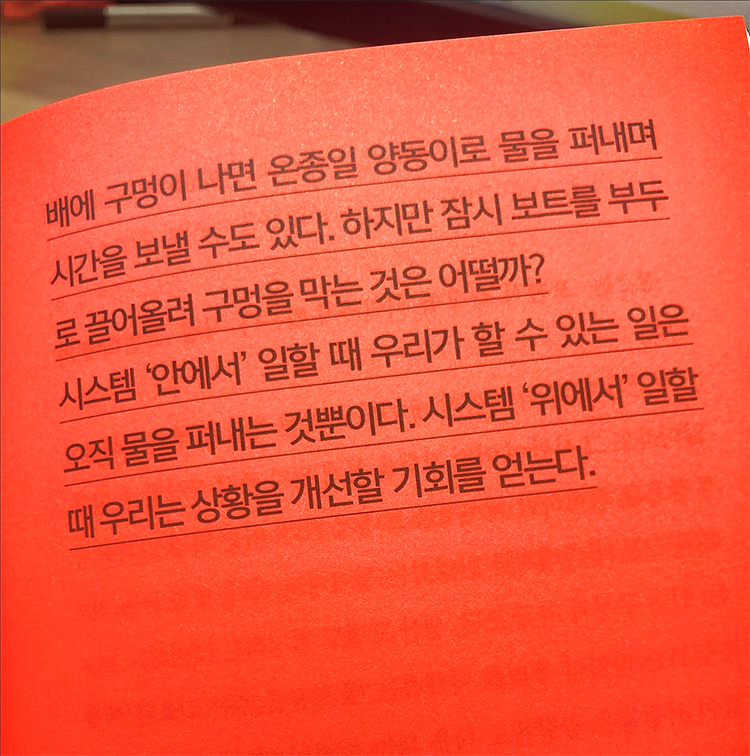 한편 시스템은 변화하게 됩니다. 변화의 동인은 커뮤니케이션, 경쟁, 공동체 행동 또는 규제, 생산수단 또는 자본활용, 제약의 완화(또는 신설), 문화적 변화입니다. 아마존의 제프 베조스와 매켄지 부부는 인터넷이 많은 산업을 변화시킬 것을 인식하고, 작은 변화인 책을 판매하는 온라인 상점을 시작했습니다. 그리고 한 걸음 더 나아가 연쇄적으로 더 큰 변화를 일이키는 물건의 설계와 제조, 배송, 판매 방식을 혁신했습니다.